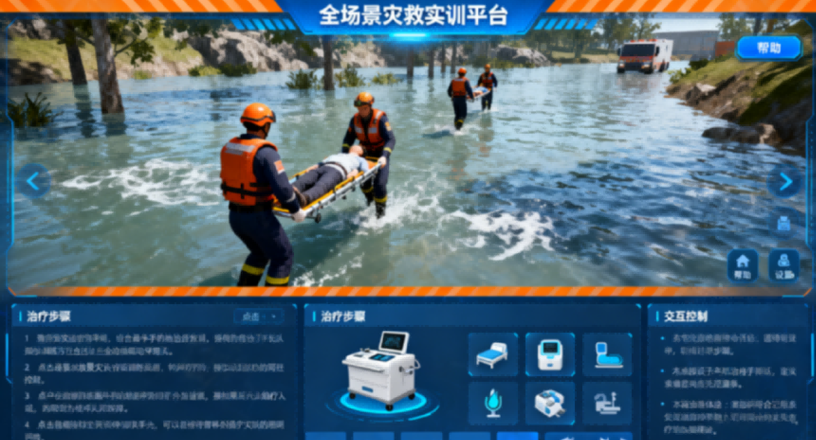 整合“混合现实(MR) + 沉浸式LED显示 + AI智能分析”技术,实现从单人技能训练到多人协同救援的全场景覆盖。